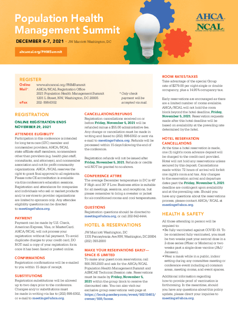 Population Health Management Summit DECEMBER 67, 2021 JR Marriott Washington, DC canal.org×PHMSummitROOM RATES×TAXESREGISTER Online:Mail*:fax:www.ahcancal.org×Summit HCA×NCAA Registration Office