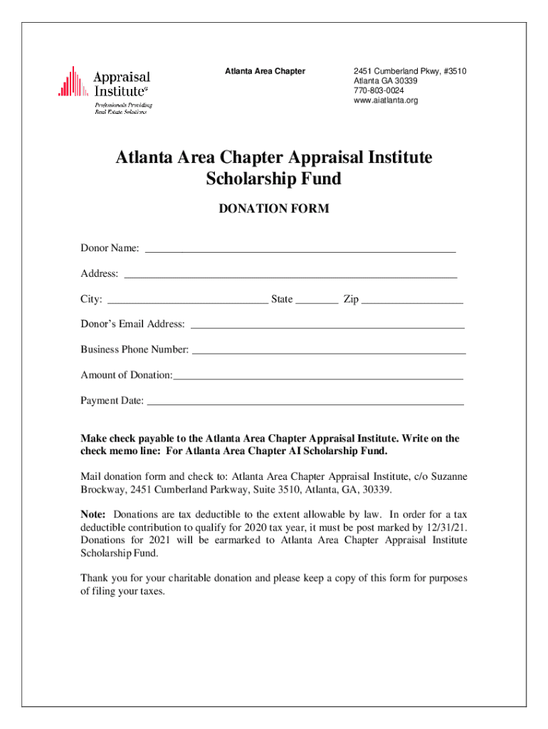 Atlanta Area Chapter2451 Cumberland Pkwy, #3510 Atlanta GA 30339 7708030024 www.aiatlanta.orgAtlanta Area Chapter Appraisal Institute Scholarship Fund DONATION FORM Donor Name: ___ Address: ___ City: