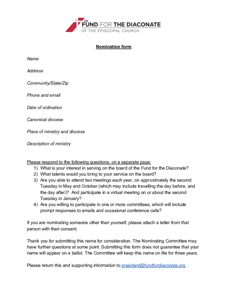 Nomination form Name Address Community×State×Zip Phone and email Date of ordination Canonical diocese Place of ministry and diocese Description of ministryPlease respond to the following questions,