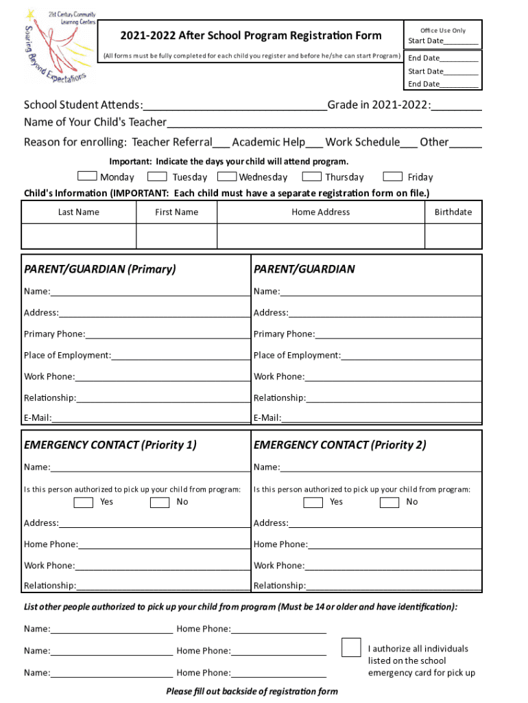 One Use Only20212022 A School Program Registry on Form Start Date___(All forms must be fully completed for each child you register and before he×she can start Program×End Date___ Start Date___ End