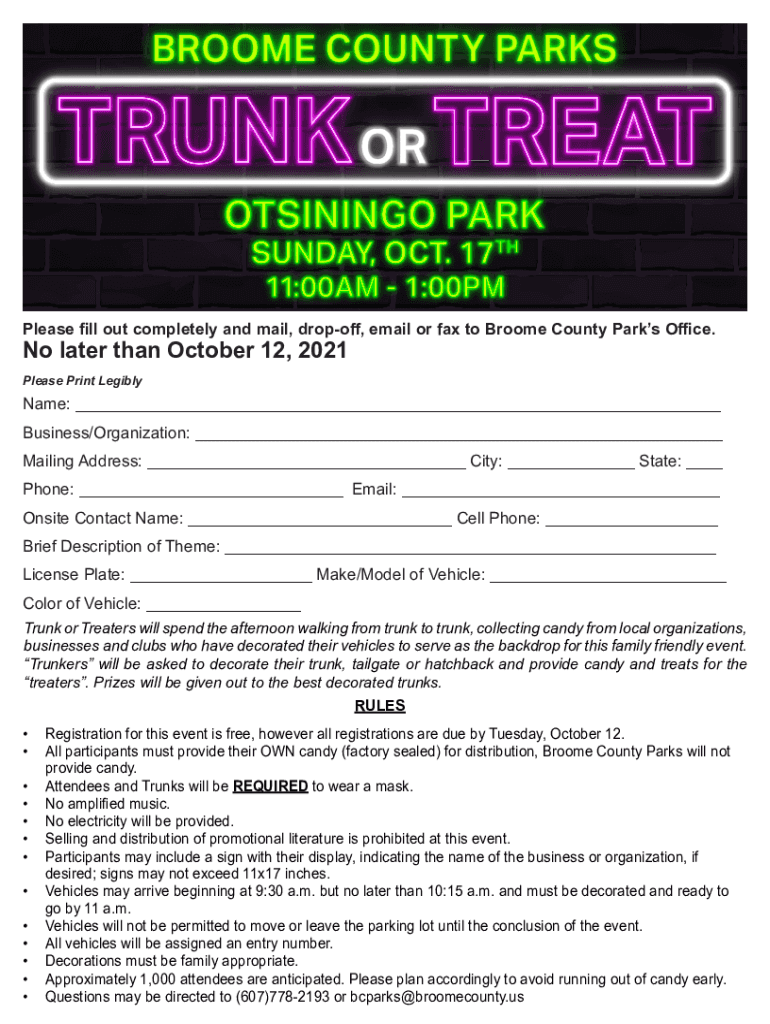 Please fill out completely and mail, drop-off, email or fax to Brooke County Parks Office. No later than October 12, 2021, Please Print LegiblyName: ___ Business×Organization: ___ Mailing Address: