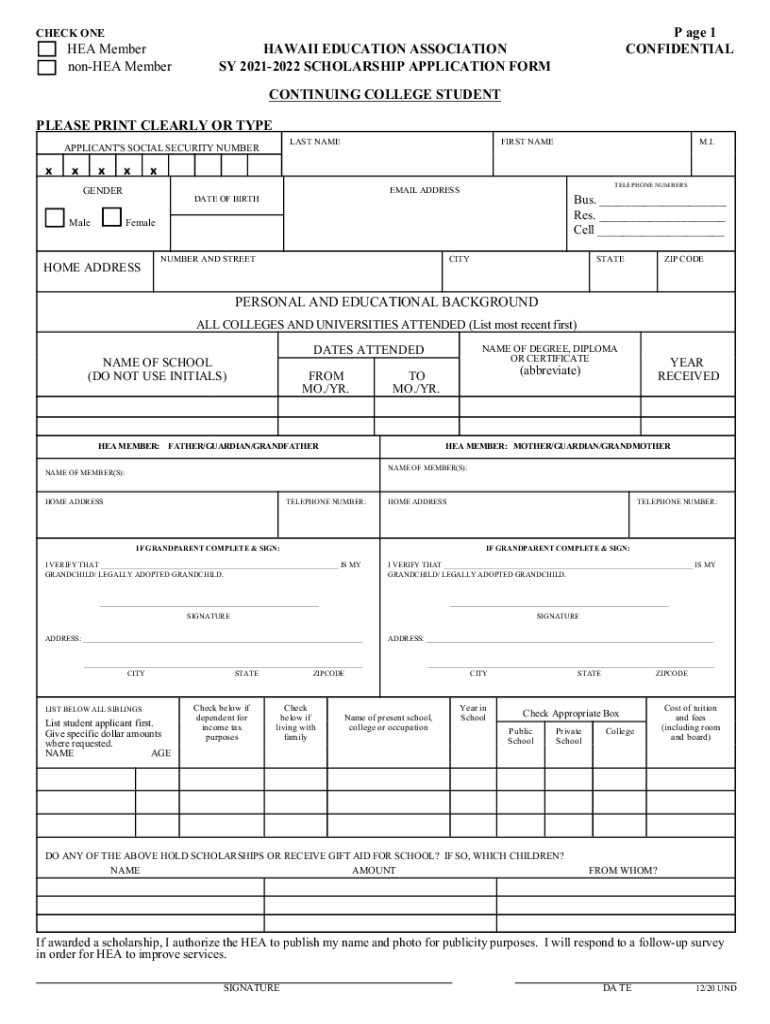 P age 1 CONFIDENTIALCHECK ONEIDA Member none MemberHAWAII EDUCATION ASSOCIATION SY 20212022 SCHOLARSHIP APPLICATION FORM CONTINUING COLLEGE STUDENTPLEASE PRINT CLEARLY OR TYPE LAST NAMEAPPLICANT\'S