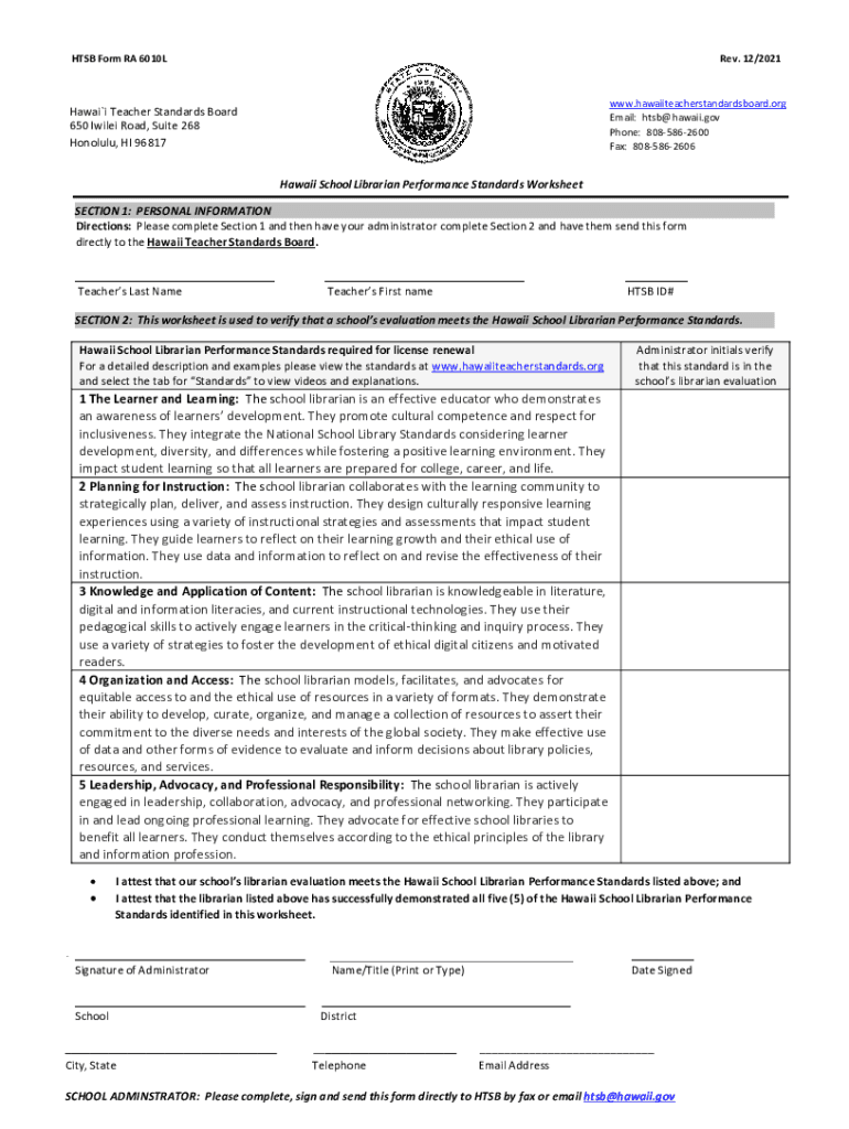 NTSB Form RA 6010LRev. 12×2021www.hawaiiteacherstandardsboard.org Email: NTSB×Hawaii.gov Phone: 8085862600 Fax: 8085862606Hawai×i Teacher Standards Board 650 Twila Road, Suite 268 Honolulu, HI