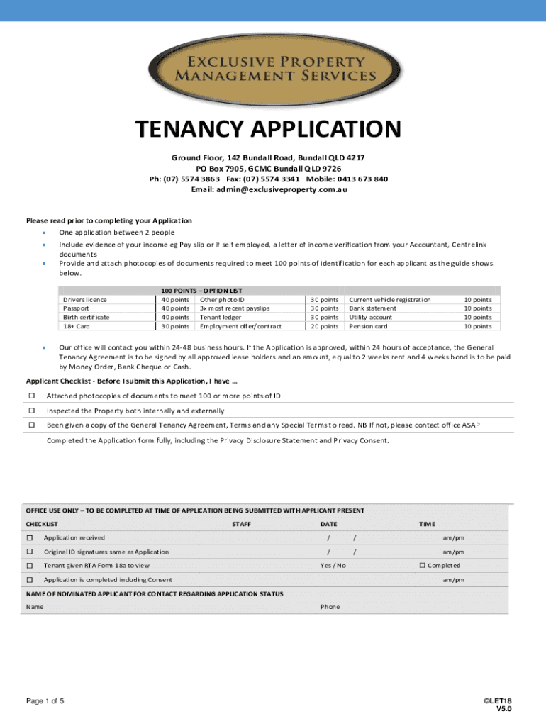 TENANCY APPLICATION First Floor, 142 Bundle Road, Bundle QLD 4217 PO Box 7905, GCC Bundle QLD 9726 pH: (07× 5574 3863 Fax: (07× 5574 3341 Mobile: 0413 673 840 Email: admin×exclusiveproperty.com.please
