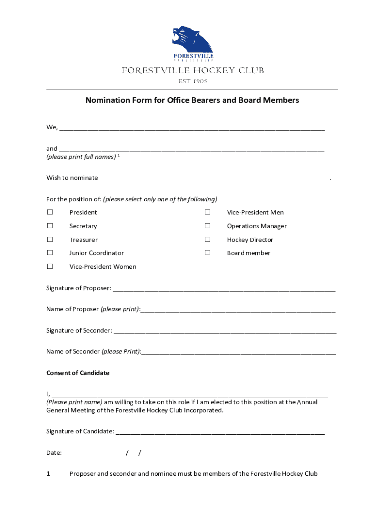 Get the free Nomination Form for Office Bearers and Board Members