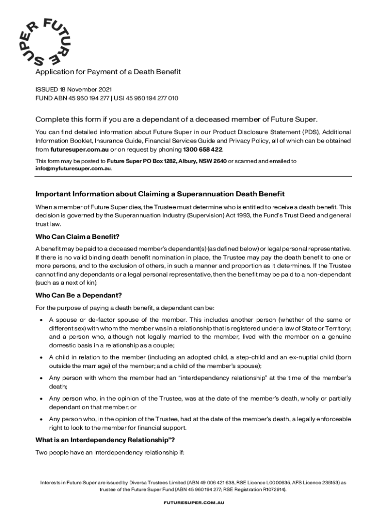 Application for Payment of a Death Benefit ISSUED 18 November 2021 FUND ABN 45 960 194 277 | USI 45 960 194 277 010Complete this form if you are a dependent of a deceased member of Future Super. You