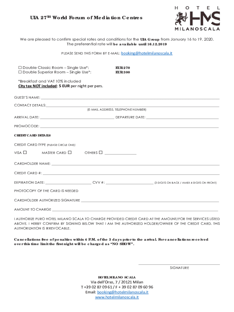UIA 27TH World Forum of Mediation Centers are pleased to confirm special rates and conditions for the UIA Group from January 16 to 19, 2020. The preferential rate will be available until 16.12.2019PLEASE