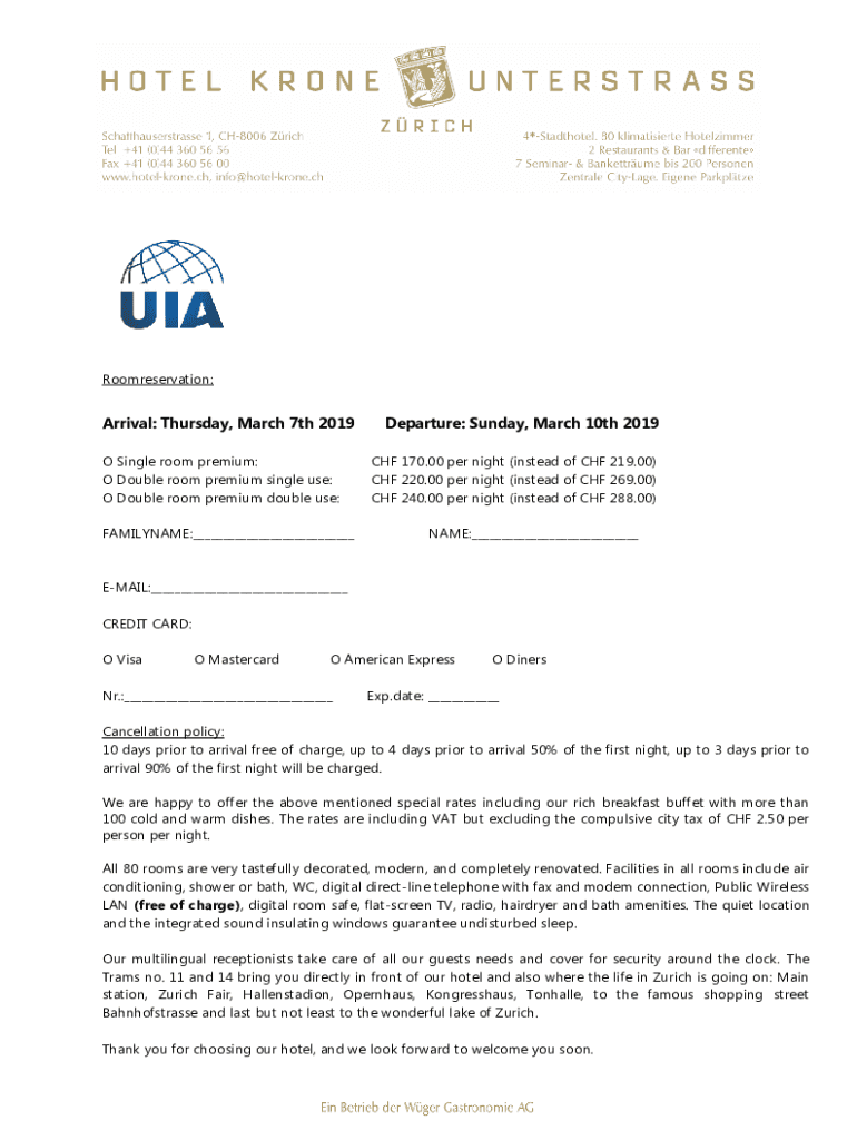 Room reservation:Arrival: Thursday, March 7th 2019 O Single room premium: O Double room premium single use: O Double room premium double use: FILENAME:___Departure: Sunday, March 10th 2019 CHF 170.00