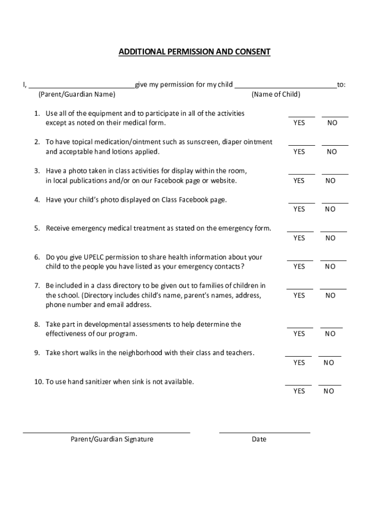 ADDITIONAL PERMISSION AND CONSENT, ___give my permission for my child ___to: (Parent×Guardian Name) (Name of Child) 1. Use all the equipment and to participate in all the activities except as noted