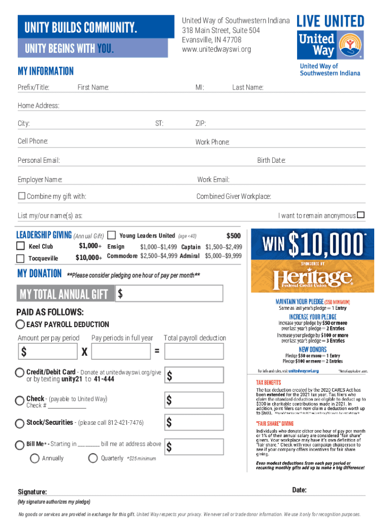 United Way of Southwestern Indiana 318 Main Street, Suite 504 Evansville, IN 47708 www.unitedwayswi.orgUNITY BUILDS COMMUNITY. UNITY BEGINS WITH YOU. MY INFORMATION Prefix×Title:First Name:MI:Last