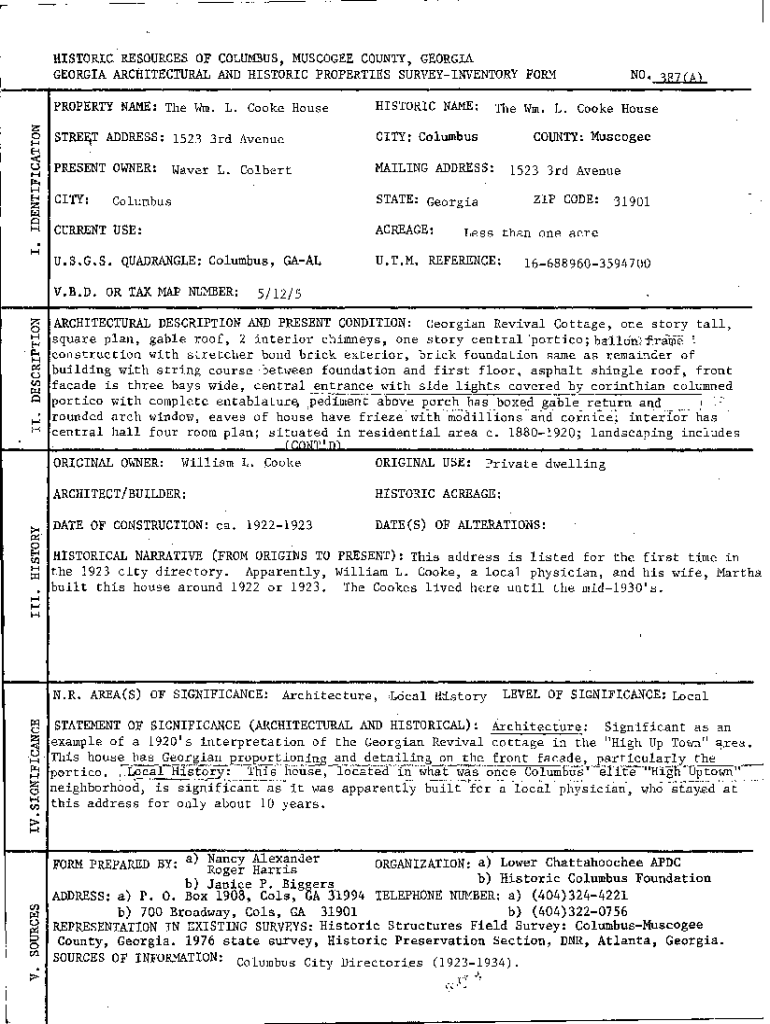 HISTORIC. RESOURCES OF COLUMBUS, MUSKOGEE COUNTY, GEORGIA ARCHITECTURAL AND HISTORIC PROPERTIES SURVEYINVENTORY FORM PROPERTY NAME: The Win. L. Cooke HouseHISTORIC NAME:STREET ADDRESS: 1523 3rd AvenueCITY: