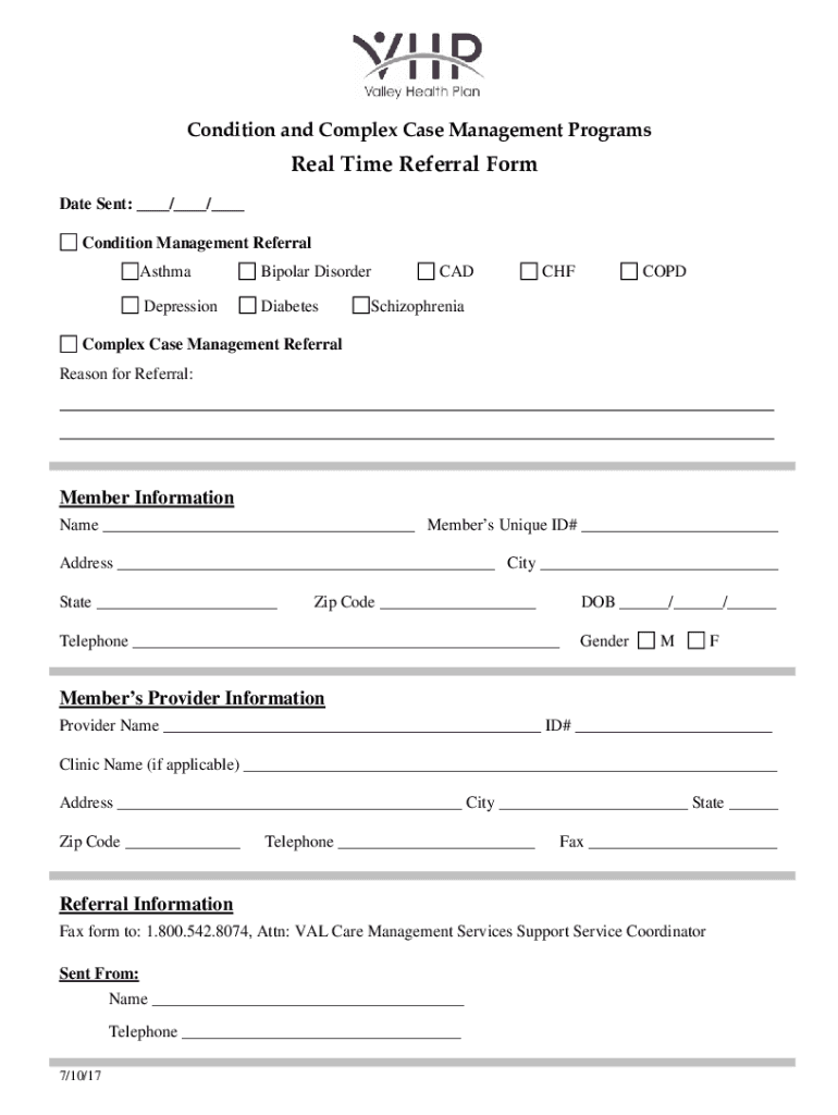 ConditionandComplexCaseManagementProgramsReal Time Referral Form Date Sent: ___/___/___ Condition Management Referral AsthmaBipolar DisorderDepressionDiabetesCADCHFCOPDSchizophreniaComplex Case Management