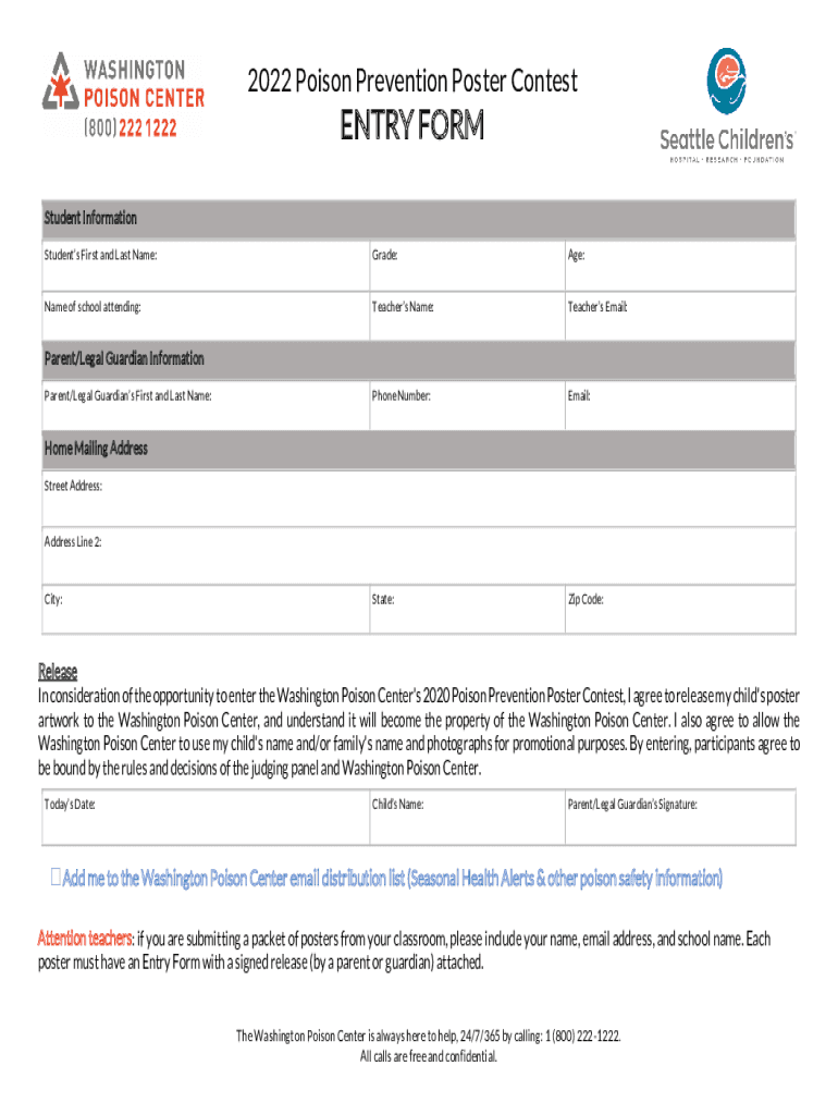 2022 Poison Prevention Poster Consistently FORM Student Information Students First and Last Name:Grade:Age:Name of school attending:Teachers Name:Teachers Email:Phone Number:Email:State:Zip Code:Parent×Legal
