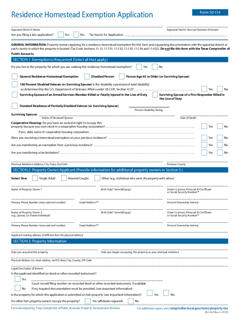 Residence Homestead Exemption ApplicationForm 50114___ Appraisal Districts Namesake you're filing a late application? Yes No___ Appraisal District Account Number (if known×Tax Year’s) for Application