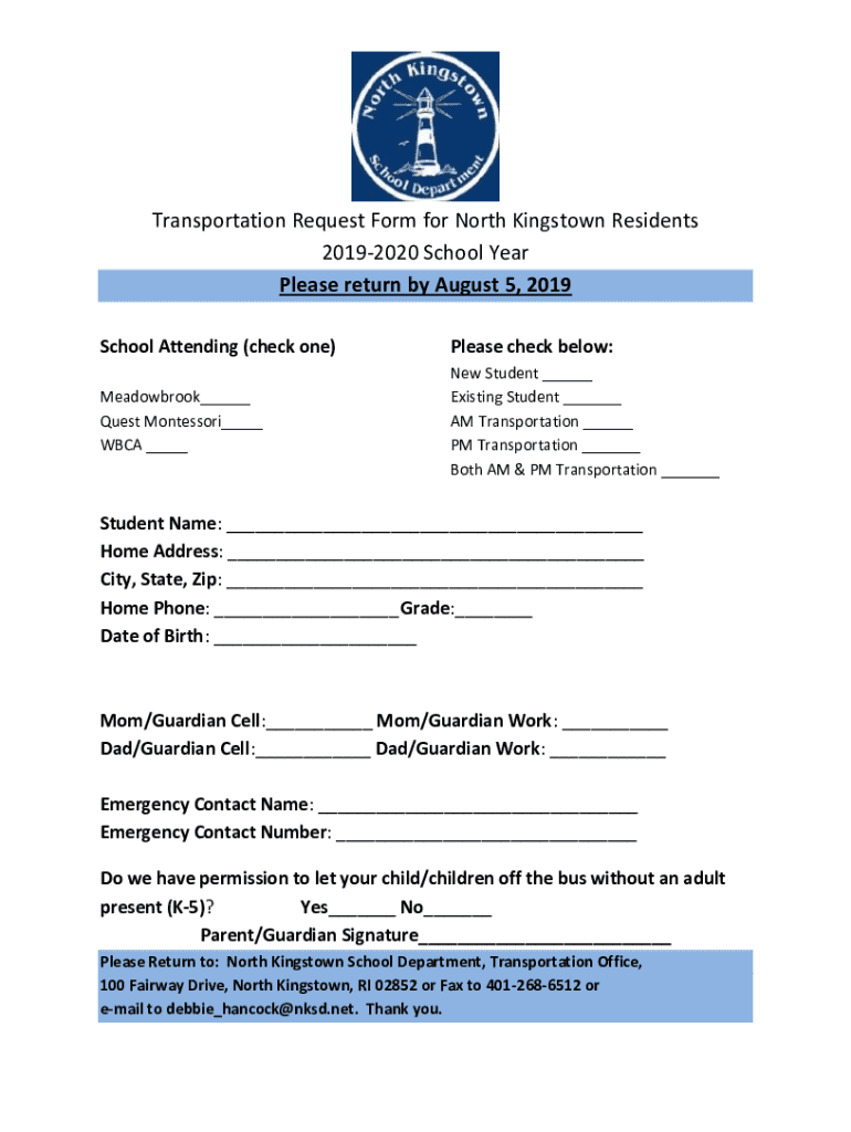 Transportation Request Form for North Kingstown Residents 20192020 School Year Please return by August 5, 2019, School Attending (check one×Please check below:Meadow brook___ Quest Montessori___