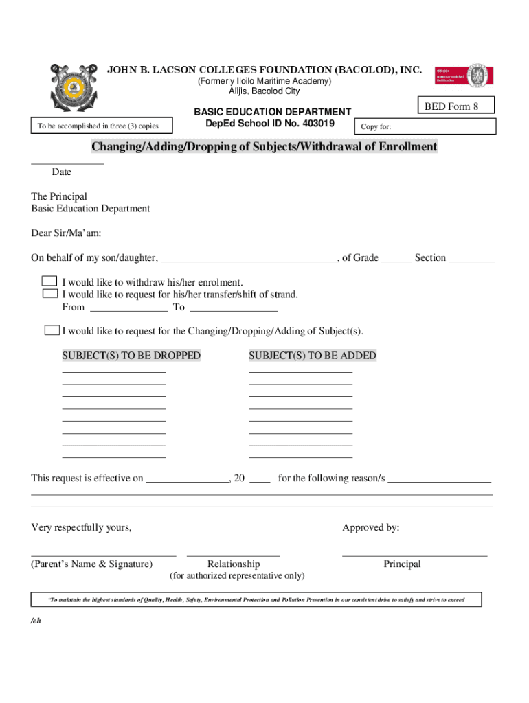 JOHN B. LAWSON COLLEGES FOUNDATION (BACKLOG×, INC. (Formerly Lilo Maritime Academy) Alibis, Backlog City BASIC EDUCATION DEPARTMENT Depend School ID No. 403019To be accomplished in three (3) copies