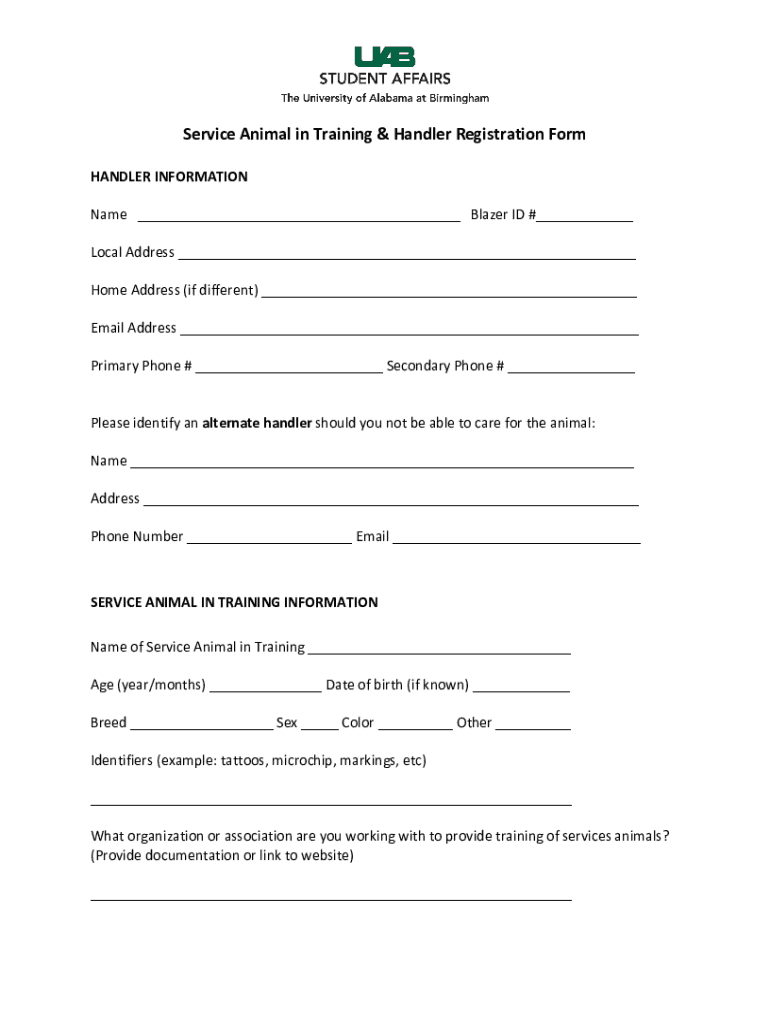 Service Animal in Training & Handler Registration Form HANDLER INFORMATION Name ___ Blazer ID #___ Local Address ___ Home Address (if different) ___ Email Address ___ Primary Phone # ___ Secondary