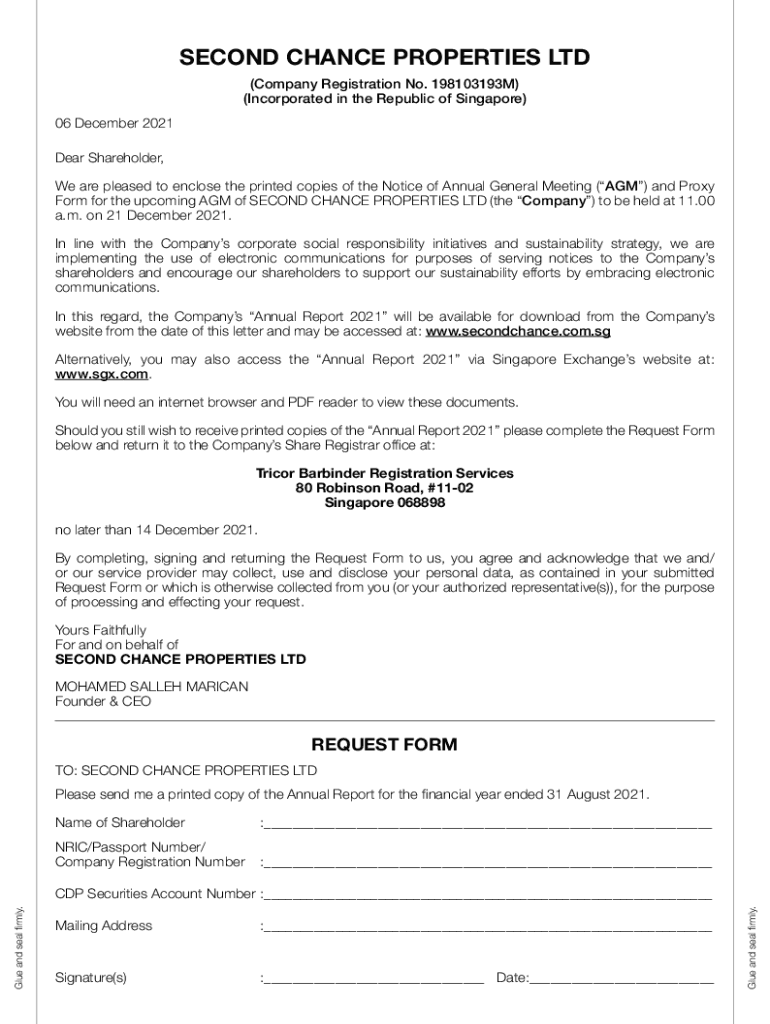 SECOND CHANCE PROPERTIES LTD (Company Registration No. 198103193M) (Incorporated in the Republic of Singapore) 06 December 2021 Dear Shareholder, We are pleased to enclose the printed copies of the