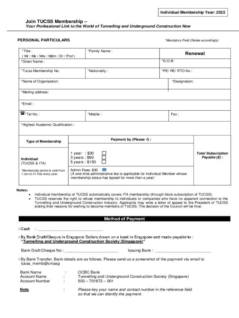 Individual Membership Year: 2022Join TUCKS Membership Your Professional Link to the World of Tunneling and Underground Construction Personal PARTICULARS×Mandatory Field (Delete accordingly)*Title