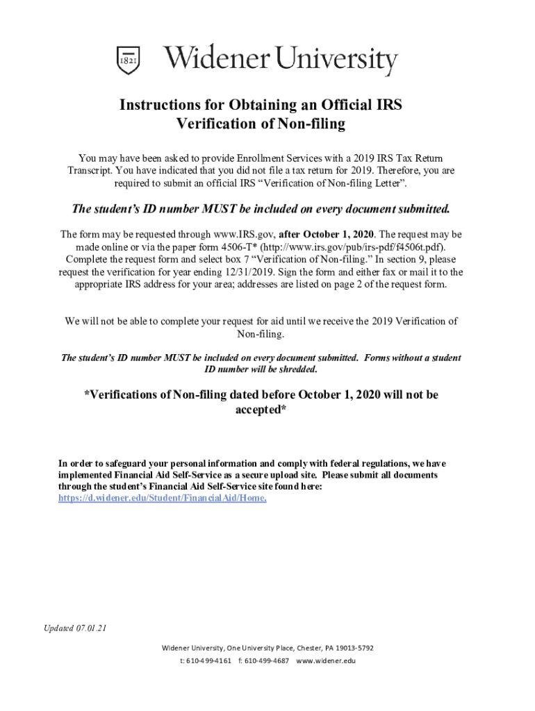 Instructions for Obtaining an Official IRS Verification of Nonfiling You may have been asked to provide Enrollment Services with a 2019 IRS Tax Return Transcript. You have indicated that you did not
