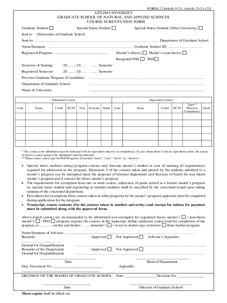 FORM2 [Article 9 ×3), Article 21×1)(2)]ATI LIM UNIVERSITY GRADUATE SCHOOL OF NATURAL AND APPLIED SCIENCES COURSE SUBSTITUTION FORM Graduate StudentSpecial Status Student (Other University×Sent