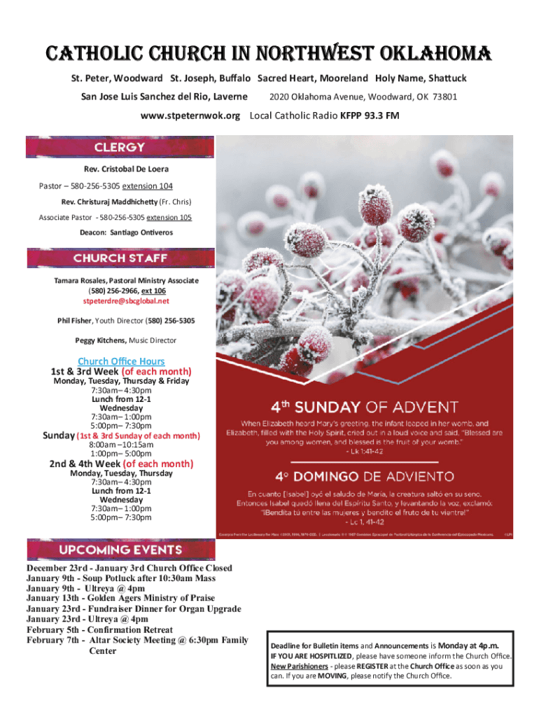 CATHOLIC CHURCH IN NORTHWEST OKLAHOMA St. Peter, Woodward St. Joseph, Built Sacred Heart, Moorland Holy Name, Shack San Jose Luis Sanchez del Rio, Laverne2020 Oklahoma Avenue, Woodward, OK 73801 www.stpeternwok.org