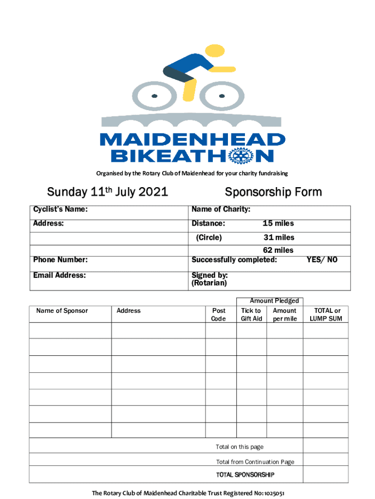 Organized by the Rotary Club of Maidenhead for your charity fundraising Sunday 11th July 2021Sponsorship Formalists Name:Name of Charity:Address:Distance:15 miles×Circle×31 miles62 miles Successfully