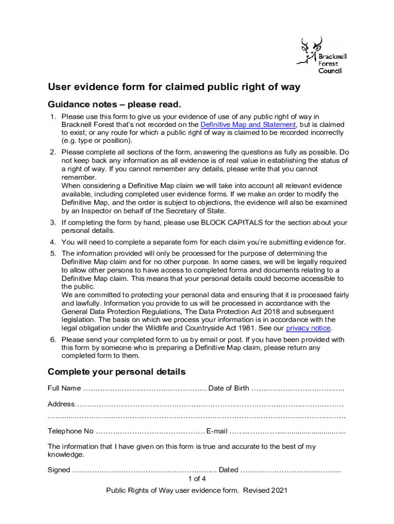 T, ×Bracknell Forest Councils evidence form for claimed public right of way Guidance notes please read. 1. Please use this form to give us your evidence of use of any public right of way in Bracknell