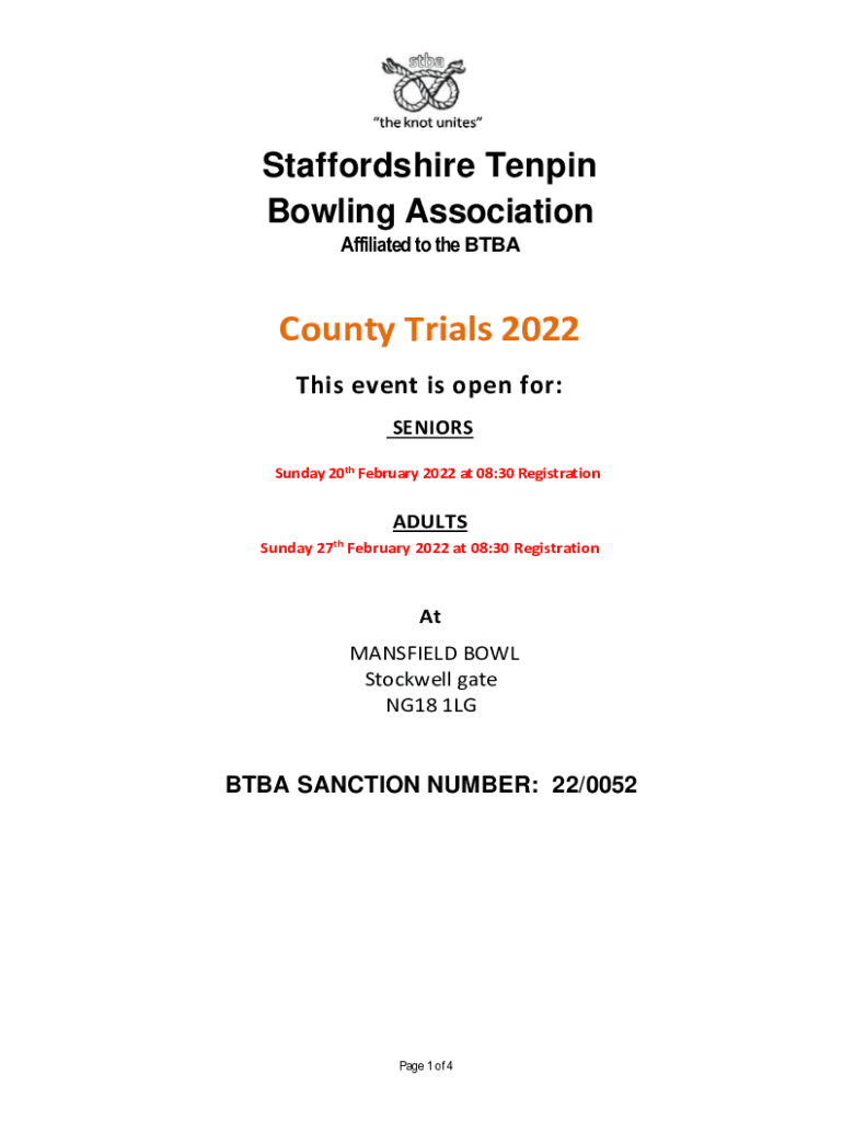 Staffordshire Tenpin Bowling Association Affiliated to the BTBACounty Trials 2022 This event is open for: SENIORS Sunday 20th February 2022 at 08:30 RegistrationADULTS Sunday27thFebruary 2022 at 08:30