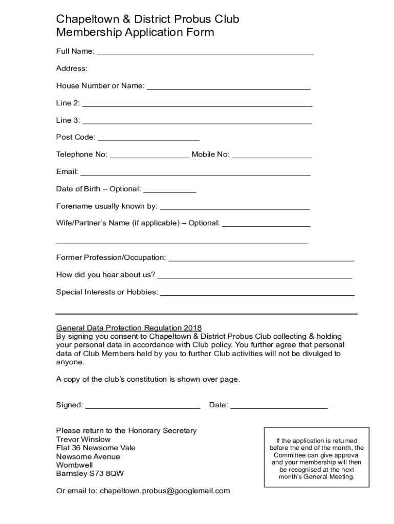 Chapel town & District Probes Club Membership Application Form Full Name: ___ Address: House Number or Name: ___ Line 2: ___ Line 3: ___Post Code: ___ Telephone No: ___ Mobile No: ___ Email: ___ Date