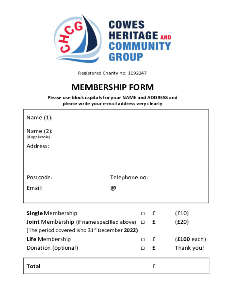 Registered Charity no: 1192247MEMBERSHIP FORM Please use block capitals for your NAME and ADDRESS, and please write your email address very clearlyName (1): Name (2): (if applicable×Address:Postcode:Telephone