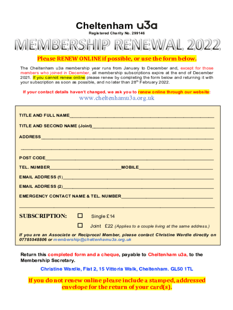 Cheltenham Registered Charity No. 299146Please RENEW ONLINE if possible, or use the form below. The Cheltenham u3a membership year runs from January to December and, except for those members who joined
