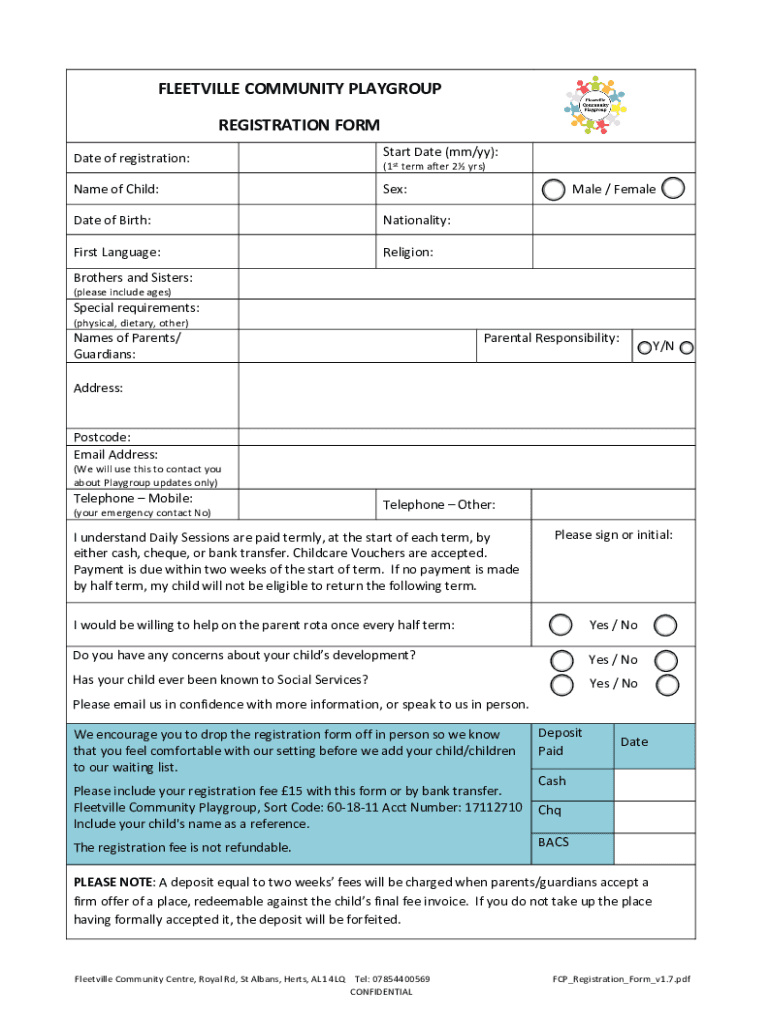 GREENVILLE COMMUNITY PLAYGROUP REGISTRATION FORM Date of registration:Start Date (mm×by):Name of Child:Sex:Date of Birth:Nationality:First Language:Religion:(1st term after 2 yrs×Male / FemaleBrothers