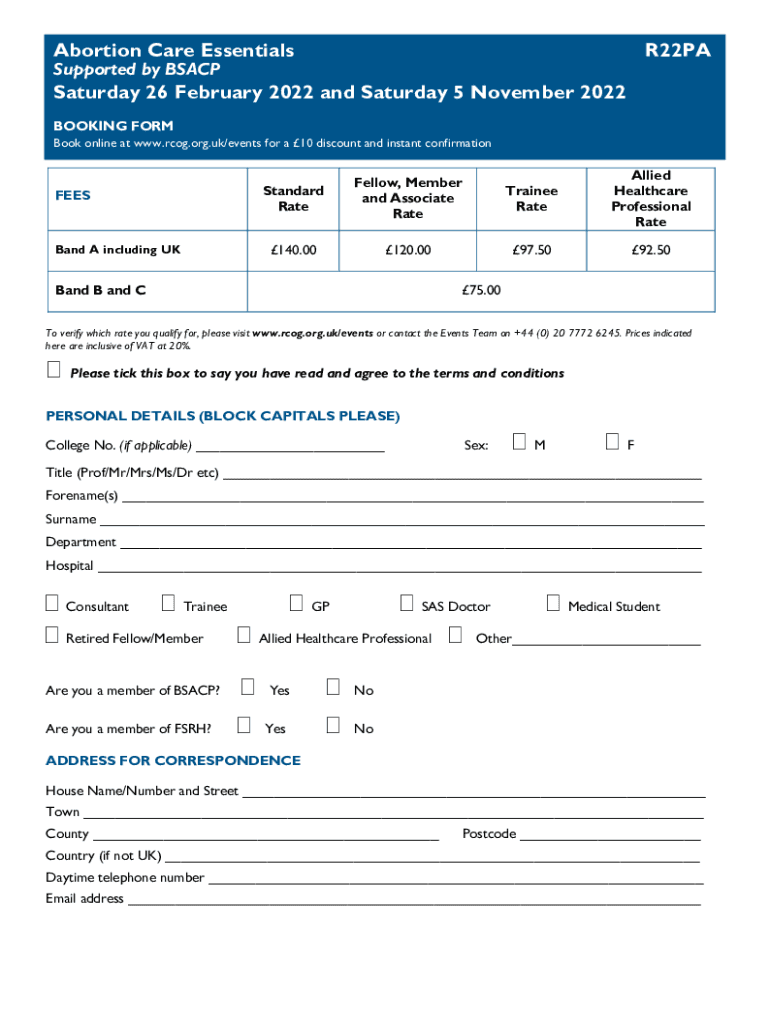 Abortion Care EssentialsR22PASupported by BSACPSaturday 26 February 2022 and Saturday 5 November 2022 BOOKING FORM Book online at www.rcog.org.uk×events for a 10 discount and instant confirmationFEESBand