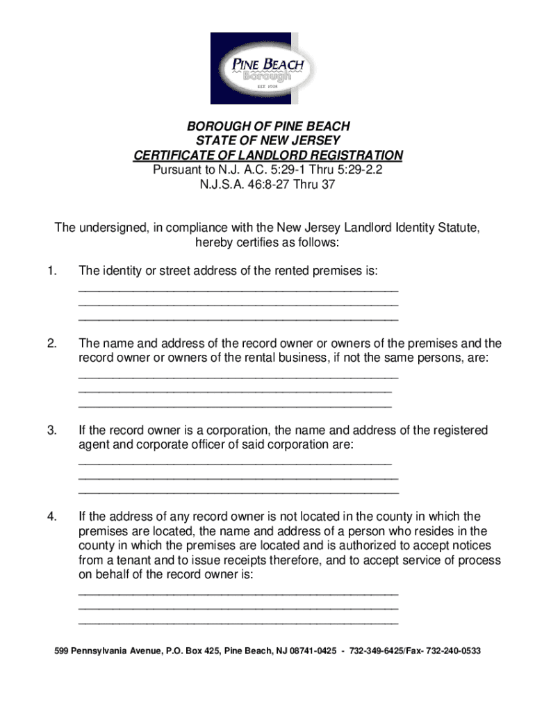 BOROUGH OF PINE BEACH STATE OF NEW JERSEY CERTIFICATE OF LANDLORD REGISTRATION Pursuant to N.J. A.C. 5:291 Through 5:292.2 N.J.S.A. 46:827 Through 37The undersigned, in compliance with the New Jersey