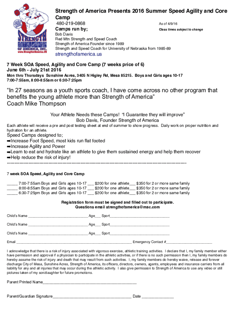 Strength of America Presents 2016 Summer Speed Agility and Core Camp 4802190868 Camps run by;As of 4×9/16 Class times subject to change Bob Davis Red MTN Strength and Speed Coach Strength of America