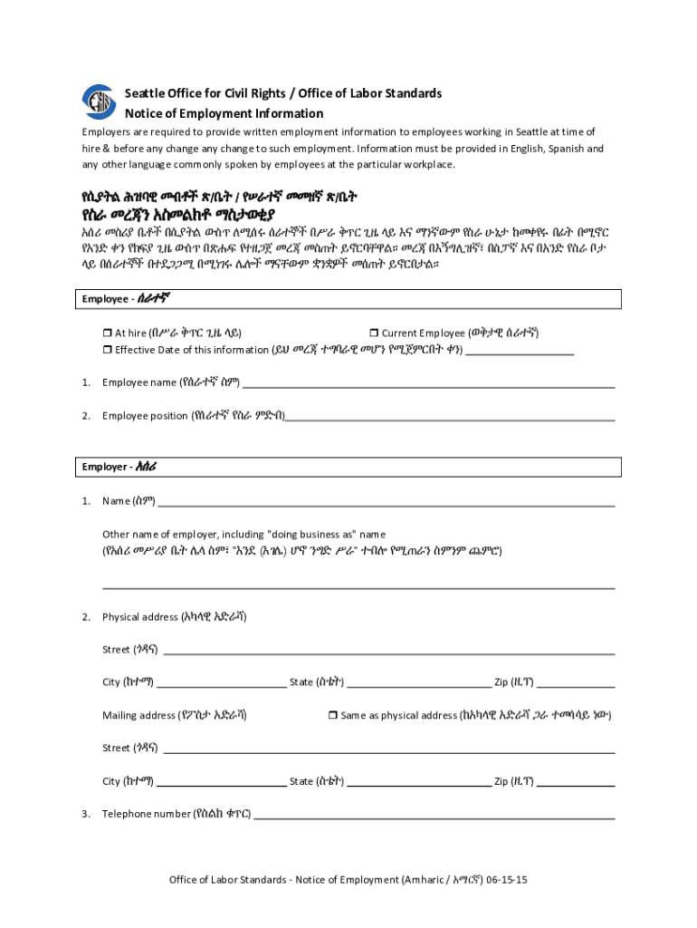 Seattle Office for Civil Rights / Office of Labor Standards Notice of Employment Information Employers are required to provide written employment information to employees working in Seattle at time