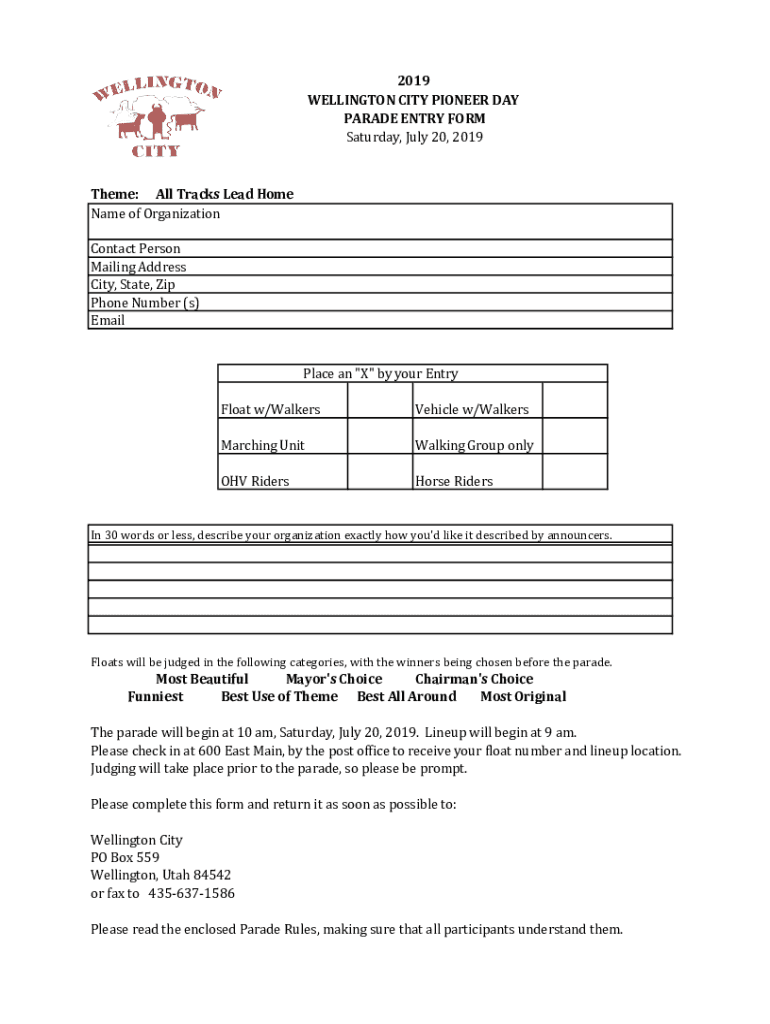 Get the free wellingtonutah.us2/6/182019 WELLINGTON CITY PIONEER DAY PARADE ENTRY FORM Saturday ...