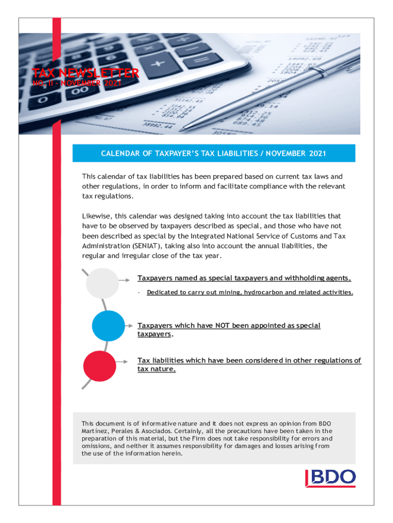 TAX NEWSLETTER NO. II NOVEMBER 2021CALENDAR OF TAXPAYERS TAX LIABILITIES / NOVEMBER 2021 This calendar of tax liabilities has been prepared based on current tax laws and other regulations, in order