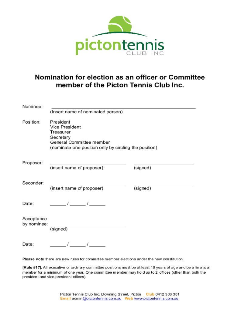 Nomination for election as an officer or Committee member of the Piston Tennis Club Inc. Nominee:___ (Insert name of nominated person×Position:President Vice President Treasurer Secretary General