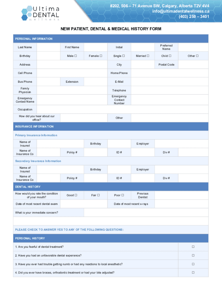New patientsultima dental wellness is a form required for new patients at Ultima Dental Wellness to provide their information and medical history.