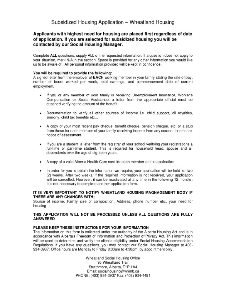 Subsidized Housing Application Wheat land Housing Applicants with the highest need for housing are placed first regardless of date of application. If you are selected for subsidized housing you will