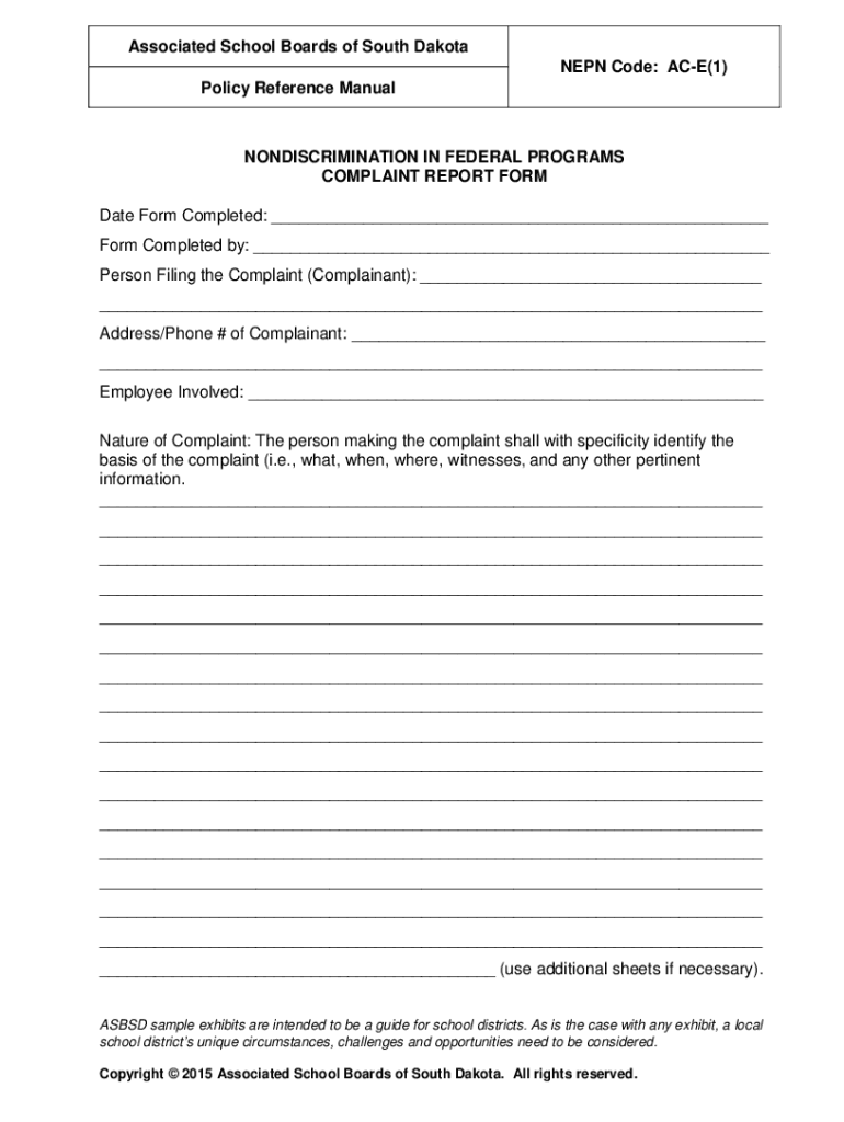 Associated School Boards of South Dakota NEON Code: ACE×1) Policy Reference ManualNONDISCRIMINATION IN FEDERAL PROGRAMS COMPLAINT REPORT FORM Date Form Completed: ___ Form Completed by: ___ Person