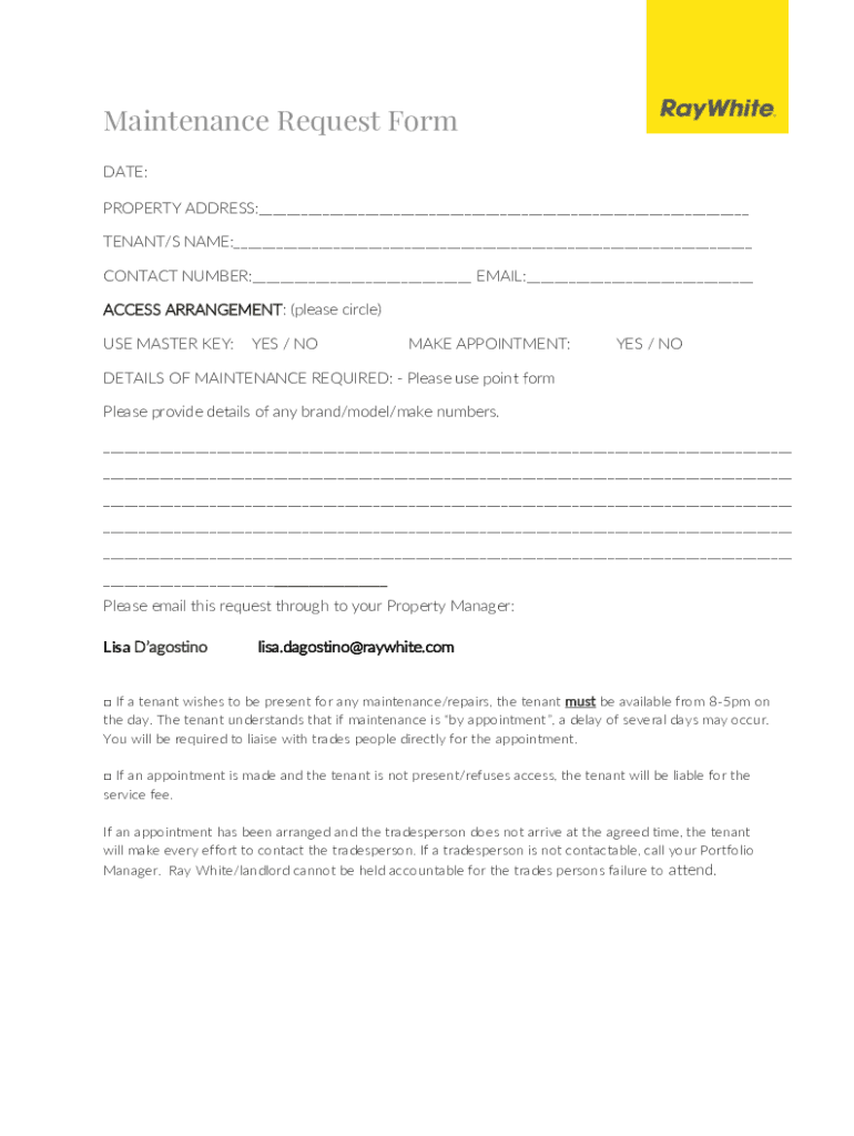 Maintenance Request Form DATE: PROPERTY ADDRESS:___ TENANT’S NAME:___ CONTACT NUMBER:___ EMAIL:___ ACCESS ARRANGEMENT: (please circle) USE MASTER KEY:YES / MAKE APPOINTMENT:YES / DETAILS OF MAINTENANCE