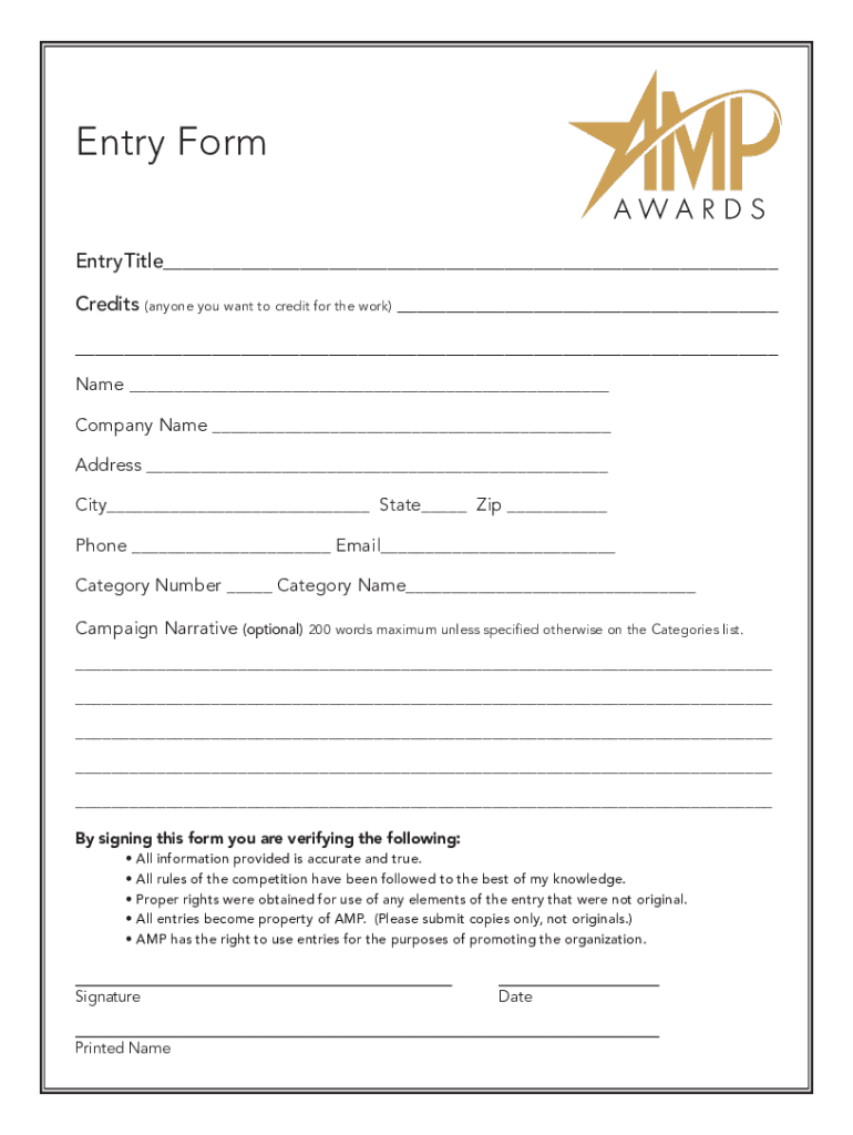 Entry Form Entry Title___ Credits (anyone you want to credit for the work) ___ ___ Name ___ Company Name ___ Address ___ City___ State___ Zip ___ Phone ___ Email___ Category Number ___ Category Name___