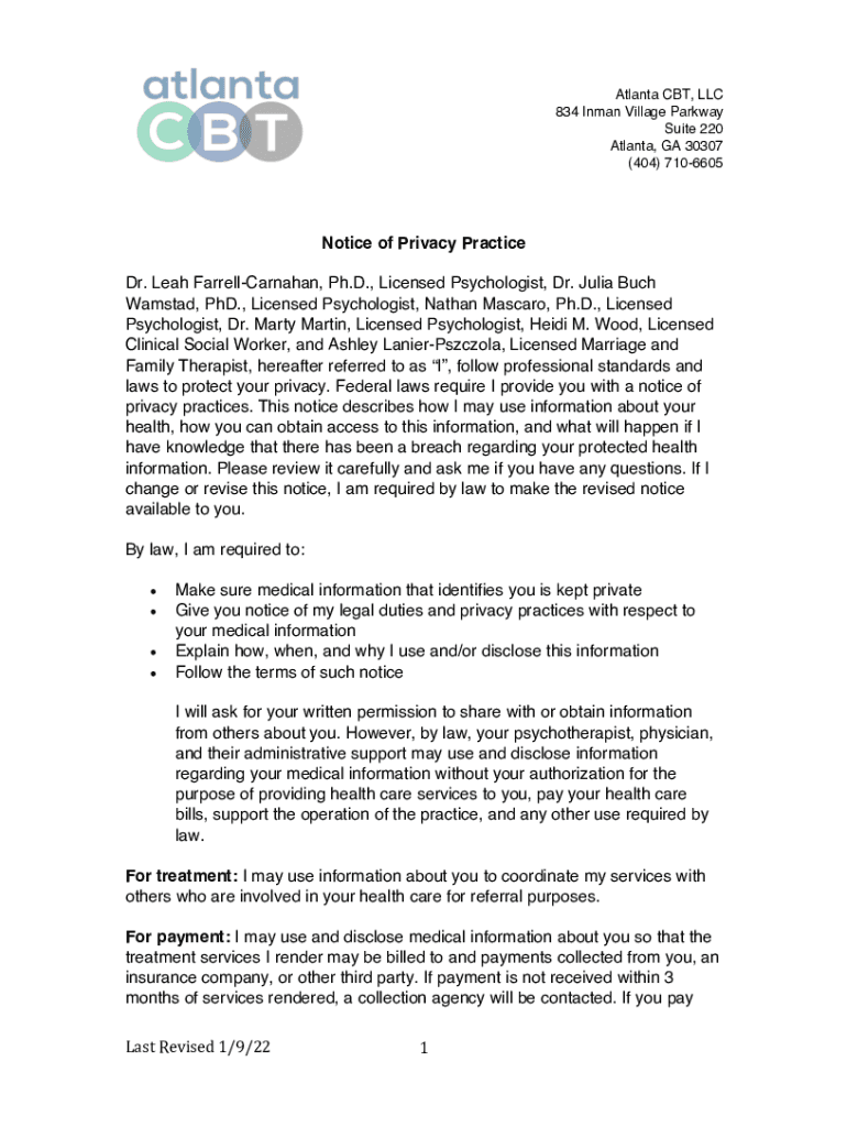Atlanta CBT, LLC 834 Unman Village Parkway Suite 220 Atlanta, GA 30307 ×404) 7106605Notice of Privacy Practice Dr. Leah FarrellCarnahan, Ph.D., Licensed Psychologist, Dr. Julia Such Wasted, PhD.,