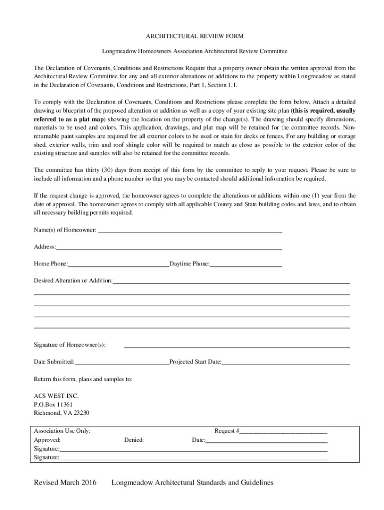 ARCHITECTURAL REVIEW FORM Long meadow Homeowners Association Architectural Review Committee The Declaration of Covenants, Conditions and Restrictions Require that a property owner obtain the written