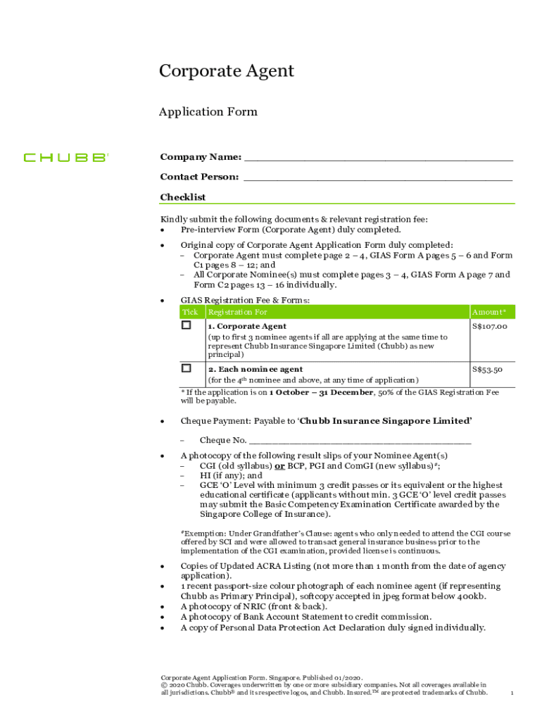 Corporate Agent Application FormCompany Name: ___ Contact Person: ___ Checklist Kindly submit the following documents & relevant registration fee: Interview Form (Corporate Agent) duly completed.