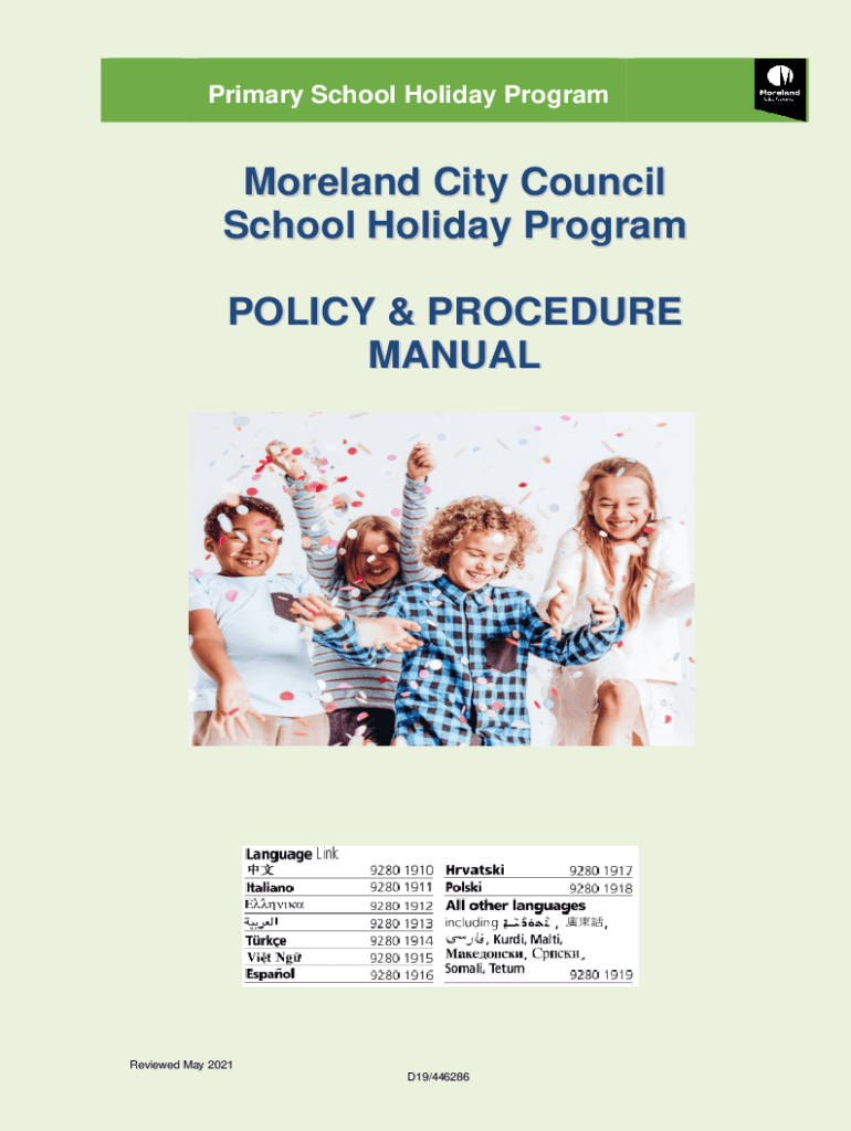 Primary School Holiday ProgramMoreland City Council School Holiday Program POLICY & PROCEDURE MANUALReviewed May 2021 D19×446286TABLE OF CONTENT Introduction..............................................................................................................................................