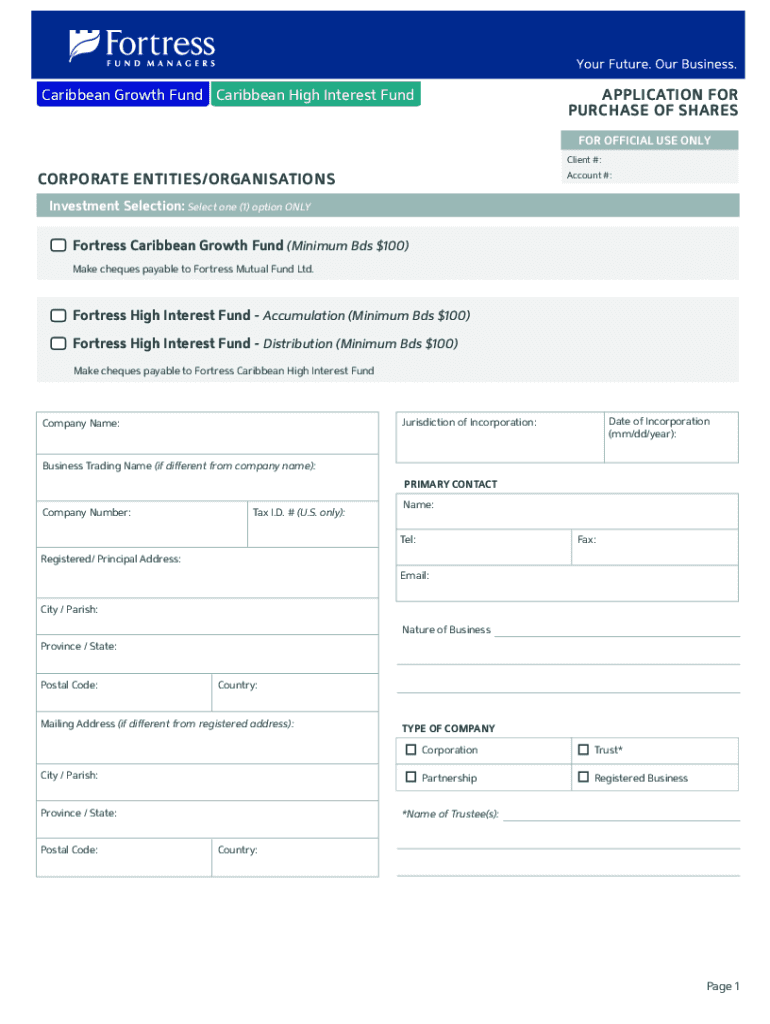 APPLICATION FOR PURCHASE OF SHARES Caribbean Growth Fund Caribbean High Interest Functor OFFICIAL USE ONLY Client #:CORPORATE ENTITIES×ORGANISATIONSAccount #:Investment Selection: Select one (1)